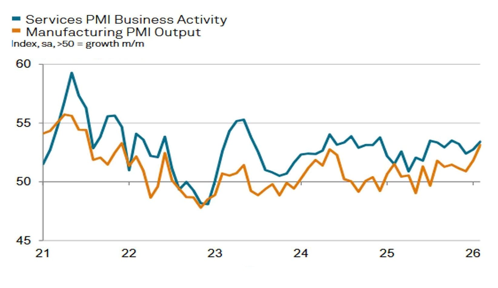Diễn biến chỉ số PMI sản lượng trong lĩnh vực sản xuất và dịch vụ toàn cầu