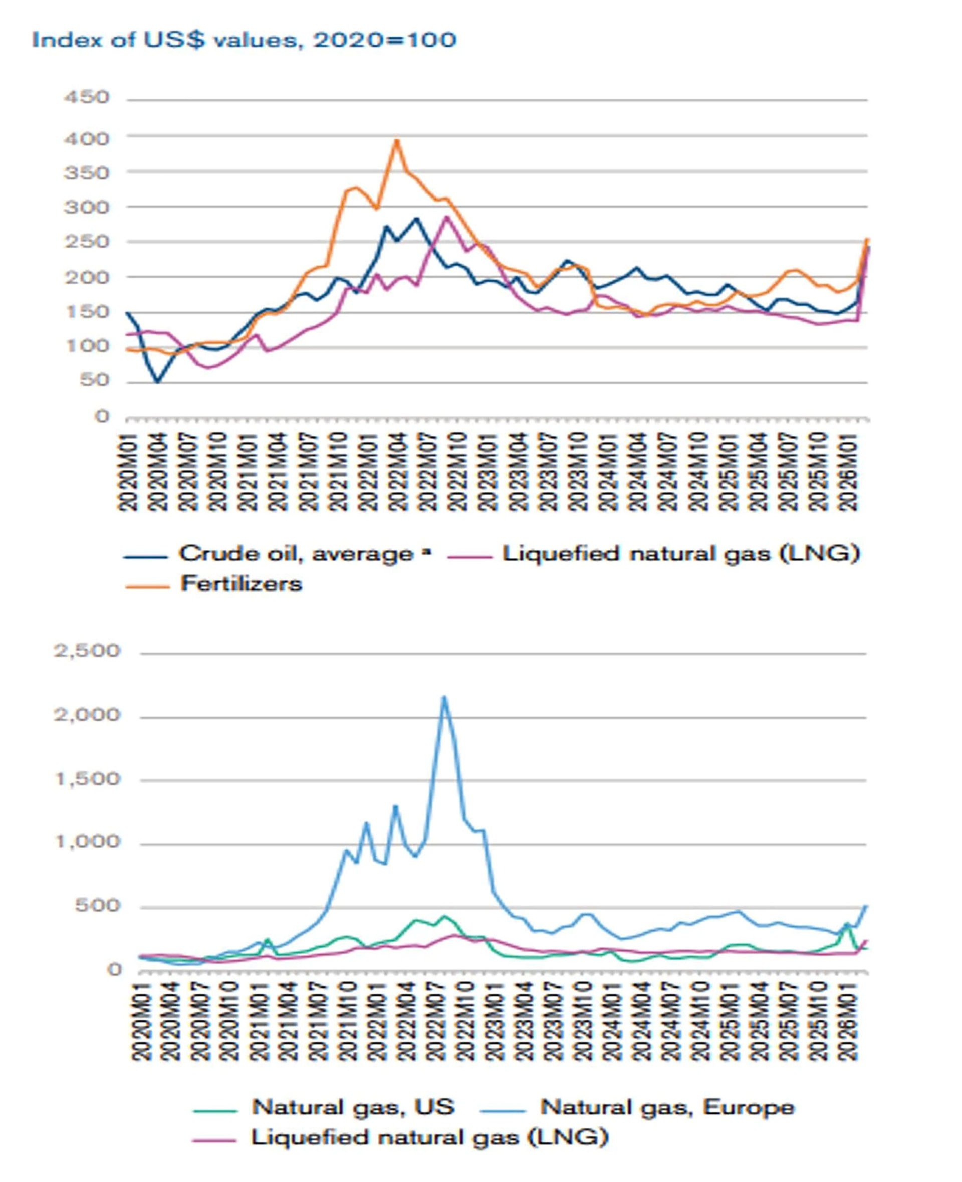 Chỉ số giá cả hàng hóa toàn cầu theo Báo cáo mới nhất của WB đã gia tăng so với cuối năm 2025, diễn biến tăng đã xuất hiện trong cả nhóm hàng năng lượng và phi năng lượng. Trong đó, đáng chú ý nhất là mức tăng của giá dầu, phân bón, kim loại sản xuất, nhất là khi xung đột xảy ra ở Trung Đông. Giá dầu thô giao dịch trên thị trường toàn cầu (dầu Brent, dầu WTI) đã tăng hơn 60% so với đầu năm và tăng hơn 40% trong tháng 3/2026. Giá dầu đã có lúc giao dịch chạm ngưỡng 115 USD/thùng – vượt xa các kịch bản dự báo được đưa ra vào thời điểm đầu tháng 3/2026. Bên cạnh đó, giá khí hóa lỏng tự nhiên giao dịch trên toàn cầu cũng tăng mạnh, nhất là tại khu vực châu Á, giá LNG giao dịch hợp đồng tương lai đã tăng gấp đôi so với đầu năm, giao dịch hơn 20 USD/MMBtu. Bên cạnh sự gia tăng mạnh mẽ của giá nhóm hàng năng lượng, chiến sự tại Trung Đông đã cản trở việc vận tải và xuất khẩu các hàng hóa quan trọng khác như phân bón, nguyên liệu sản xuất,… dẫn đến giá của các mặt hàng này cũng có xu hướng tăng, đồng thời cũng làm tăng giá các nhóm hàng phụ thuộc vào các mặt hàng này, nhất là các nhóm hàng trong lĩnh vực nông nghiệp.