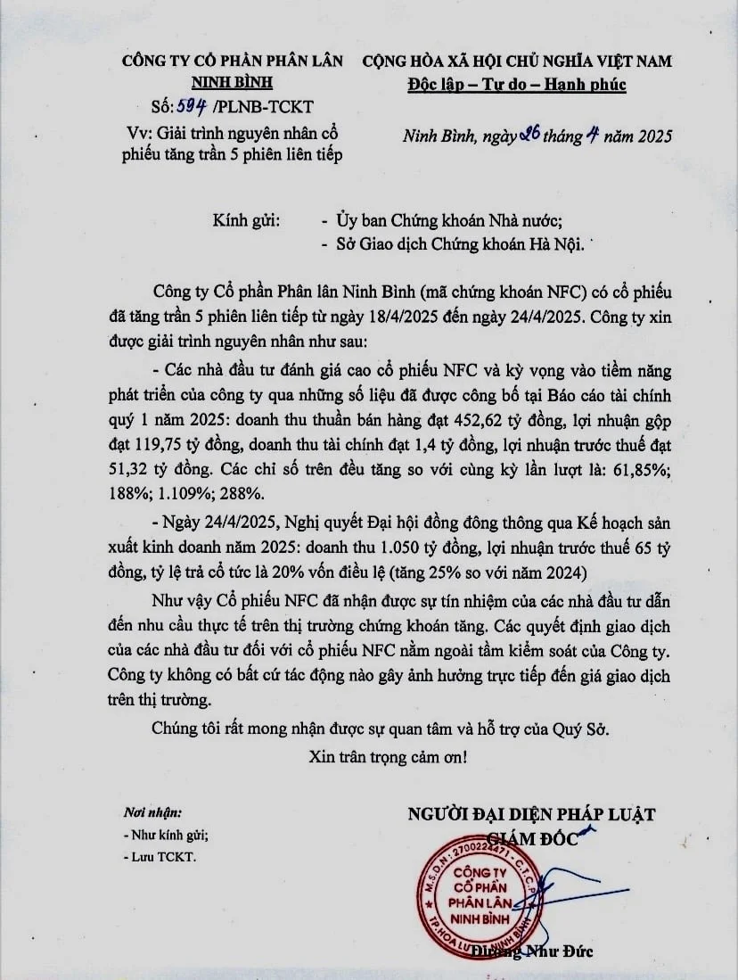 Công ty Cổ phần Phân lân Ninh Bình (HNX; mã chứng khoán: NFC) vừa có công văn gửi Ủy ban Chứng khoán giải trình việc cổ phiếu tăng hết biên độ 5 phiên liên tiếp.